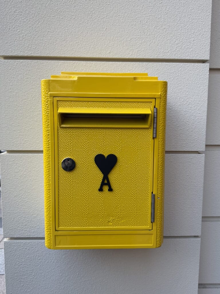 赤いバルーンとAmi Parisのロゴが入った可愛い黄色のポストが目を引きます📮
