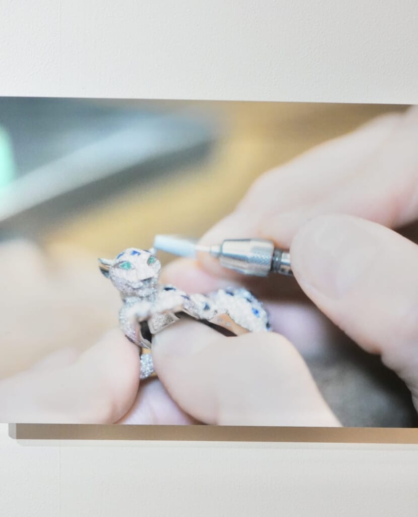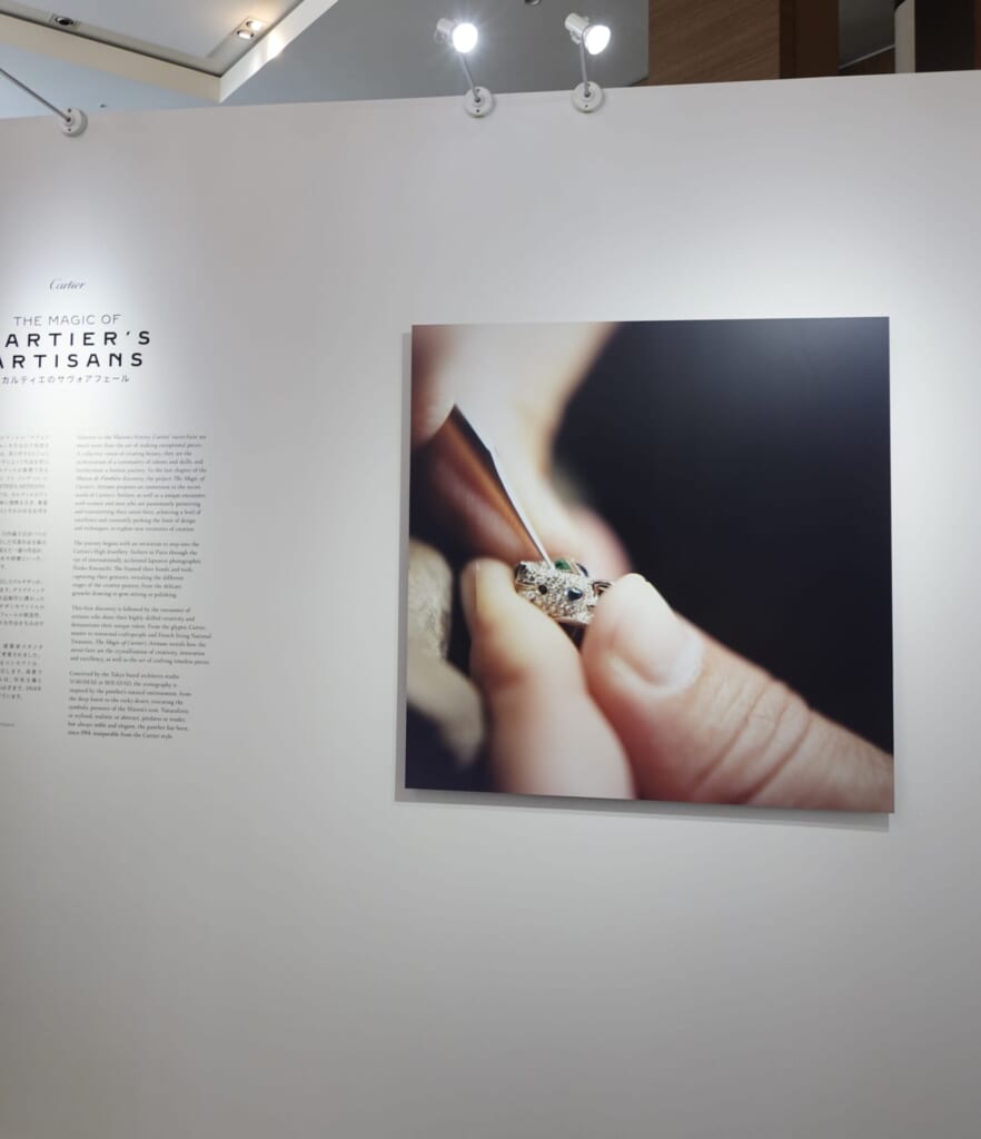 1Fではパリのハイジュエリーアトリエを撮り下ろした作品が展示されています。職人たちの繊細な手元や、宝石が放つ一瞬の光を切り取った写真は、まるでアートギャラリーにいるような美しさです。