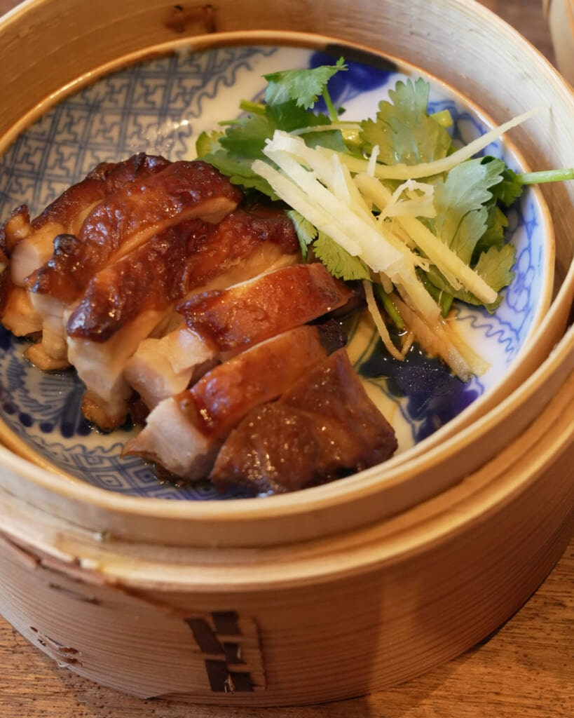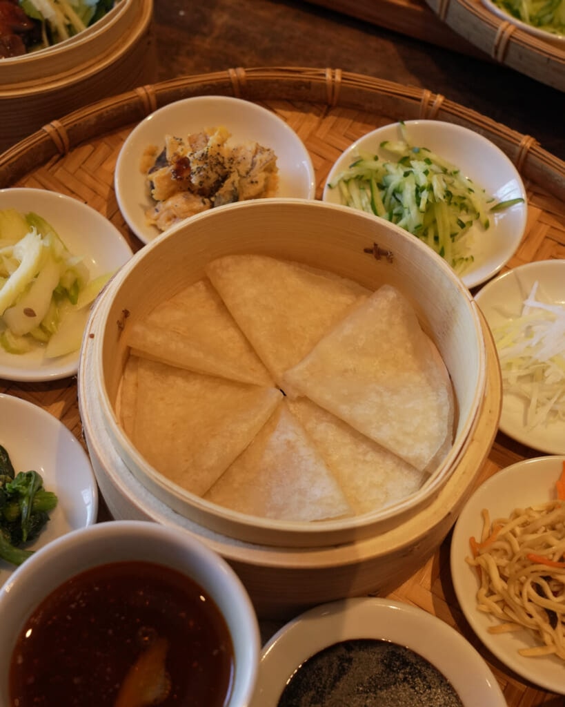 小麦粉の薄い皮で野菜や卵、肉のおかずを包んで食べる、中国北方発祥の飾らない家庭料理です。甜麺醤の鶏グリル、黒きくらげと干し豆腐の炒めもの、キャベツとセロリの酢漬け、ほうれん草の腐乳和え、ごぼうとぜんまいのスープ。食べ進めるほどにほっとするような味で、CASICAの空間にもよく似合う一皿でした。