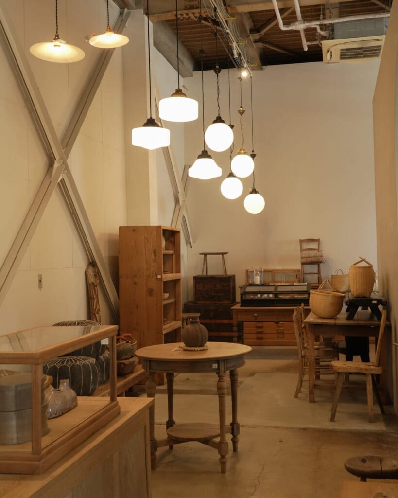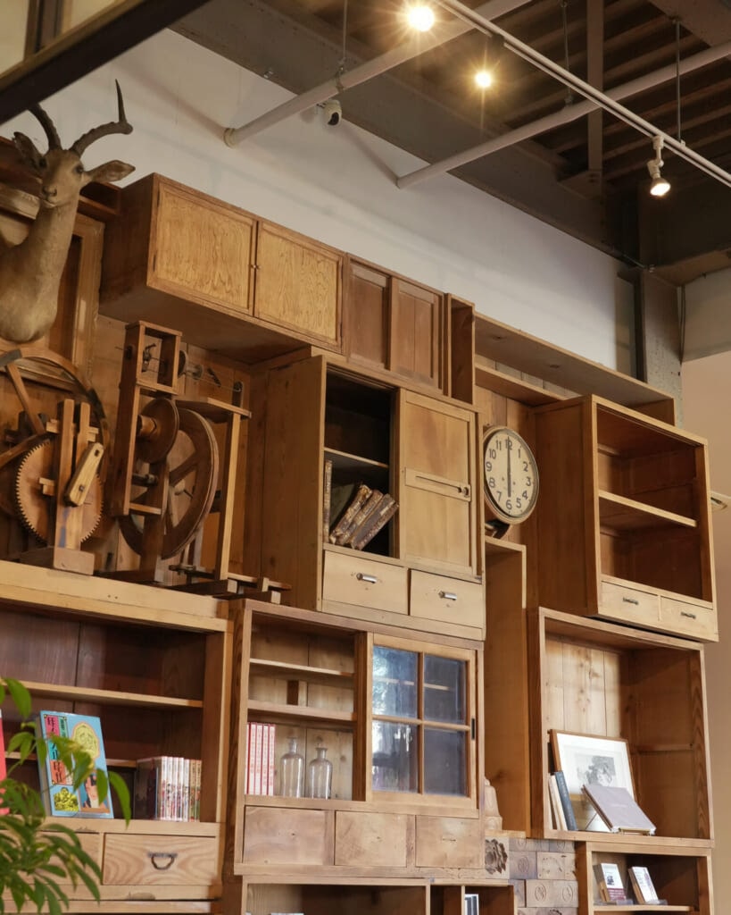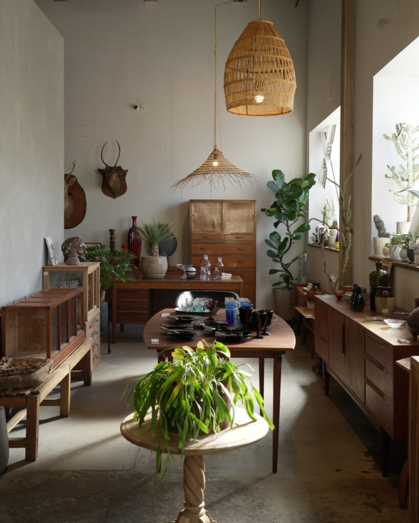 もともとの造りをできるだけ活かしながら、古家具を積み重ねた棚や、商品そのものが景色をつくるようなレイアウトが広がり、ただ陳列するのではなく、空間ごと見せているのが印象的です。