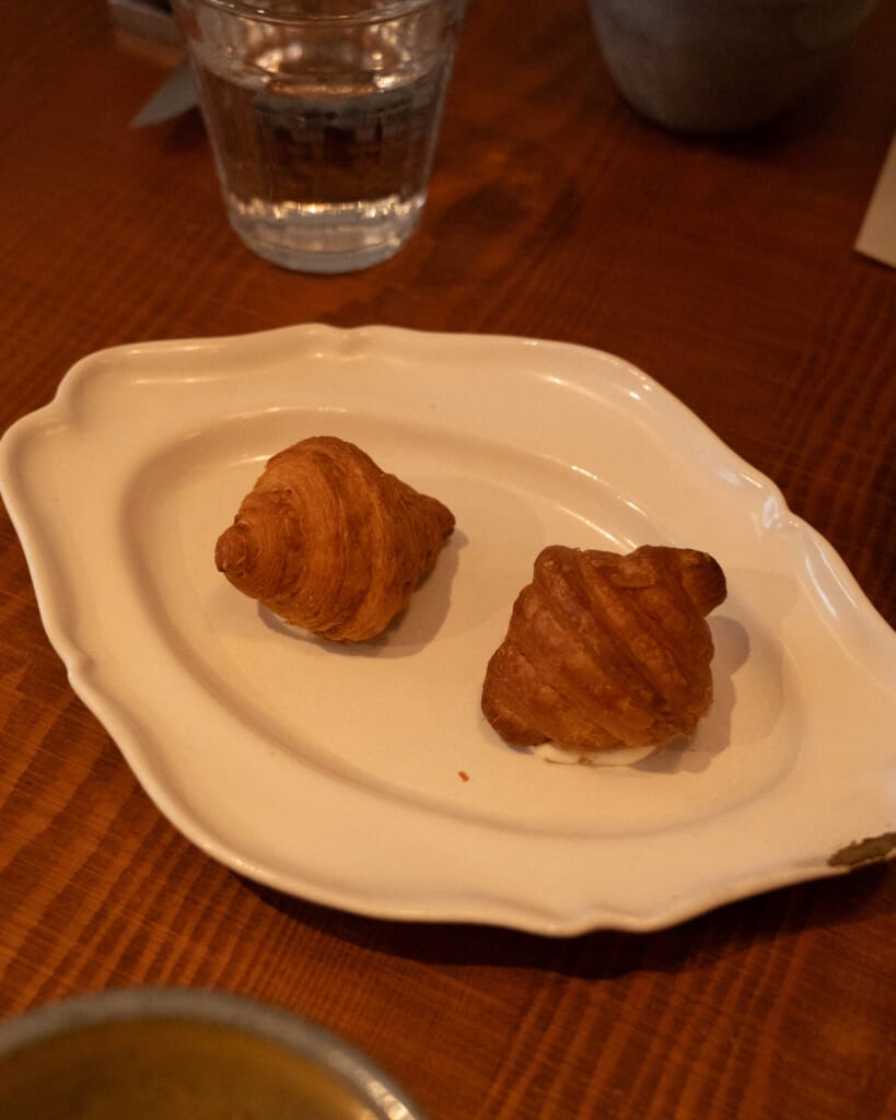 最初に供されるのは、「ミニクロワッサン べったら漬け」。