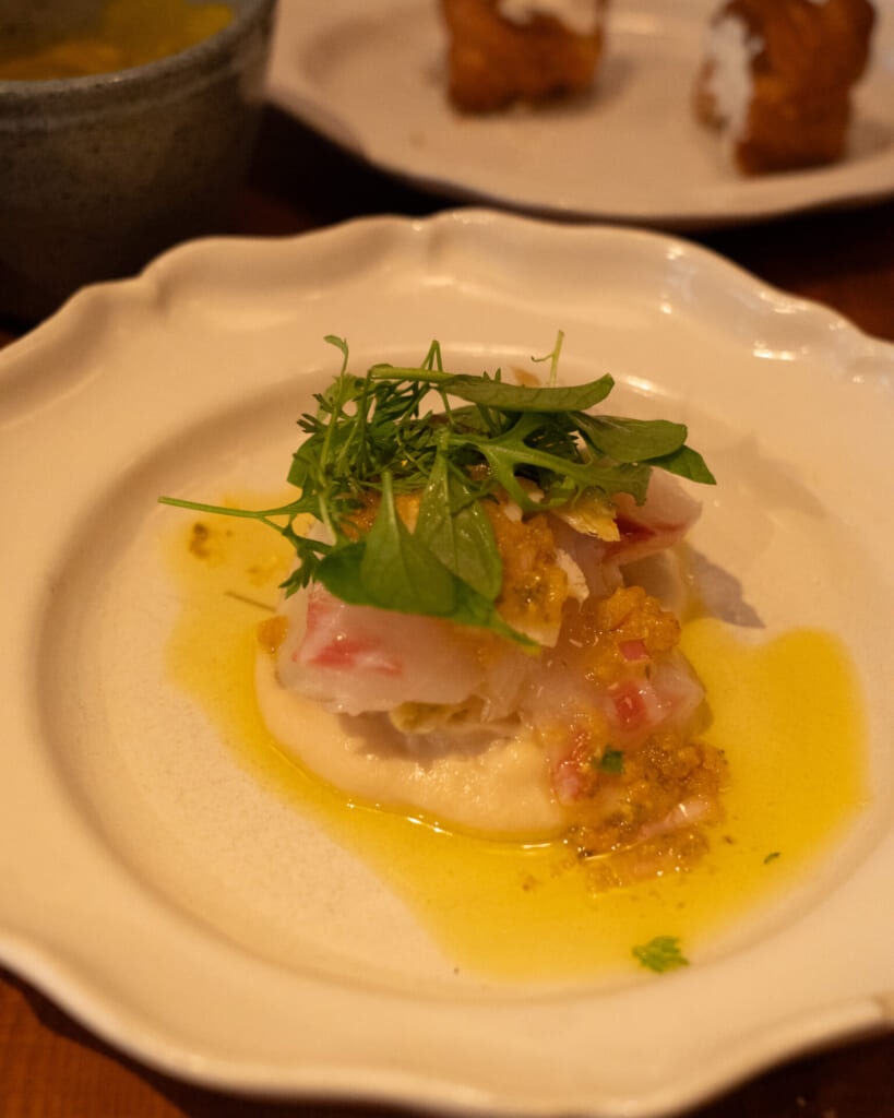 BANK内のベーカリーで人気のクロワッサンをひと口サイズに仕立て、日本橋発祥のべったら漬けとクリームチーズを合わせたアミューズです。軽やかな食感のクロワッサンに、べったら漬けのほのかな香りと塩味、クリームチーズのまろやかさが重なり、意外性がありながらも全体としてよくまとまったひと皿でした。