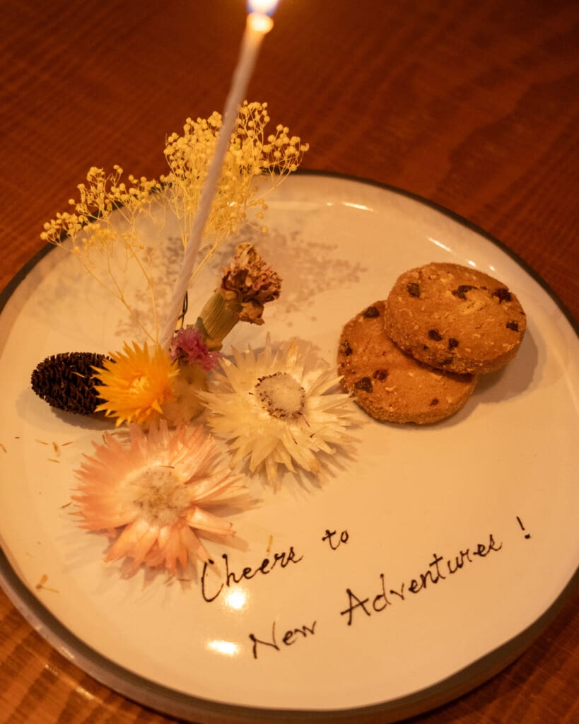 実際にお願いしたプレートには、pâtisserie ease のクッキーに加えて、かわいらしい花も添えられており、華やかさがありながらもやりすぎない、上品な仕上がりでした。希望のメッセージを入れてもらえるため、気負いすぎずに気持ちを伝えたいお祝いの席にも向いています。