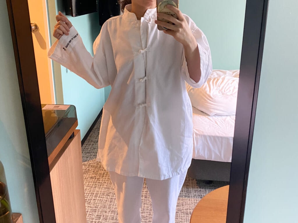 フロントボタンがチャイナ風のフロッグボタンになっていて、ぼんやりする夜の時間にほんの少しのスパイスを与えてくれます。着用すると、生地がしっかり硬めで安心感があり、オアシスでゆっくり安眠できました。