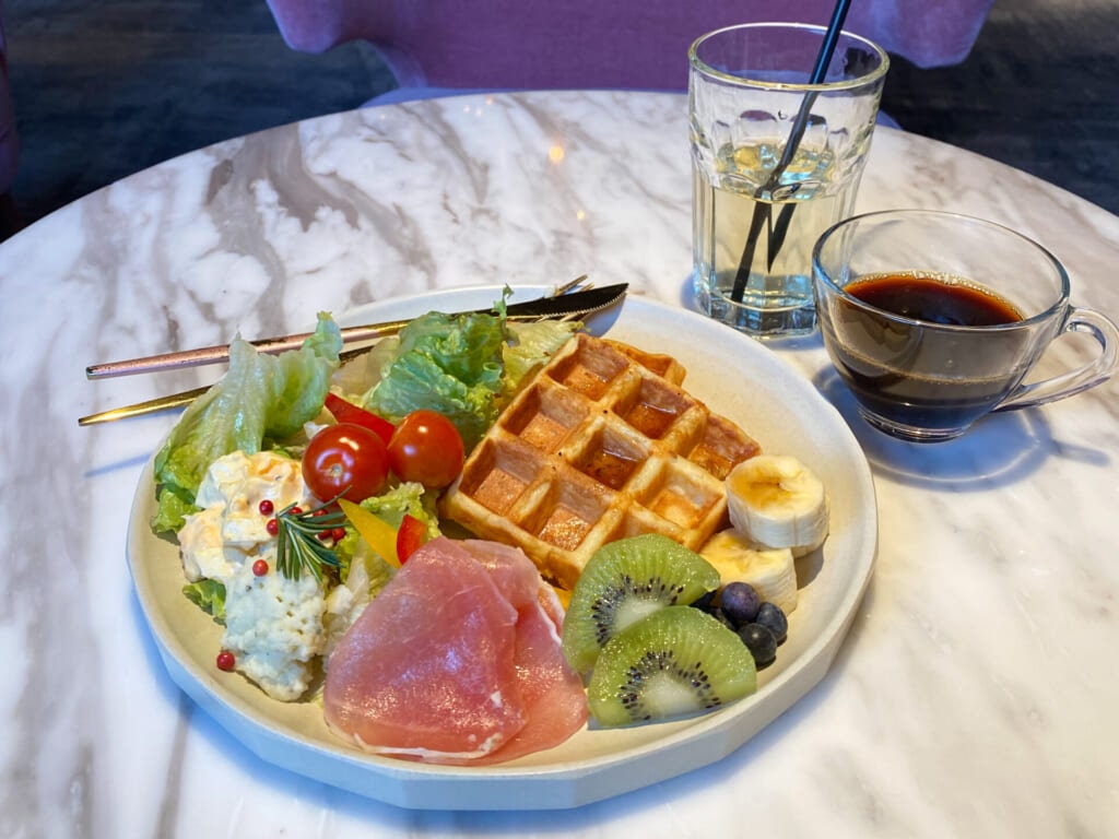ワッフルかベーグルからベースを選べ、野菜やフルーツ、ポテトサラダや生ハムなど好きな具材で自在にアレンジ可能。どう盛り付けてもオシャレになるラインナップで楽しかったです♪