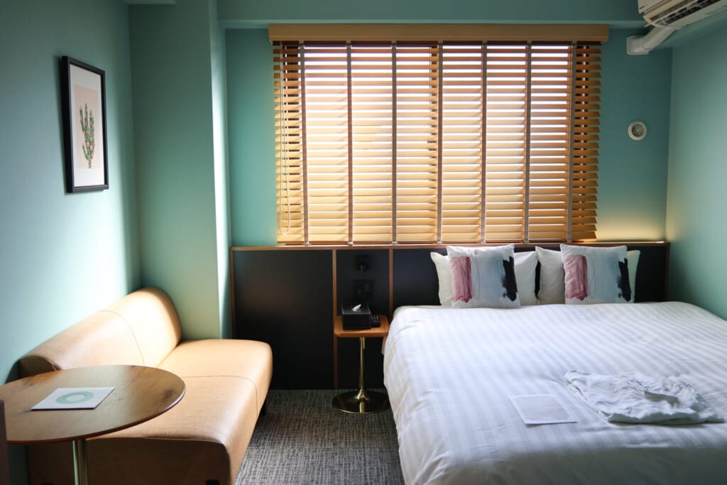 足を踏み入れた瞬間、オアシスに辿り着いたことを悟ってしまうような、エメラルドグリーンが眩しい客室。緩急が効いたインテリアがセンスよく配置され、気分が上がります。