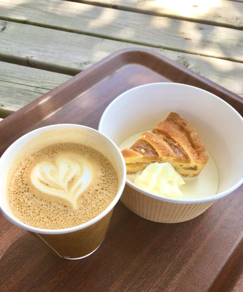 園内のカフェ【記念の森レストハウス】さんにて休憩🥤木漏れ日のもとでいただく《カフェラテ》と《ひたちなか干し芋タルト》が絶品でした🍴