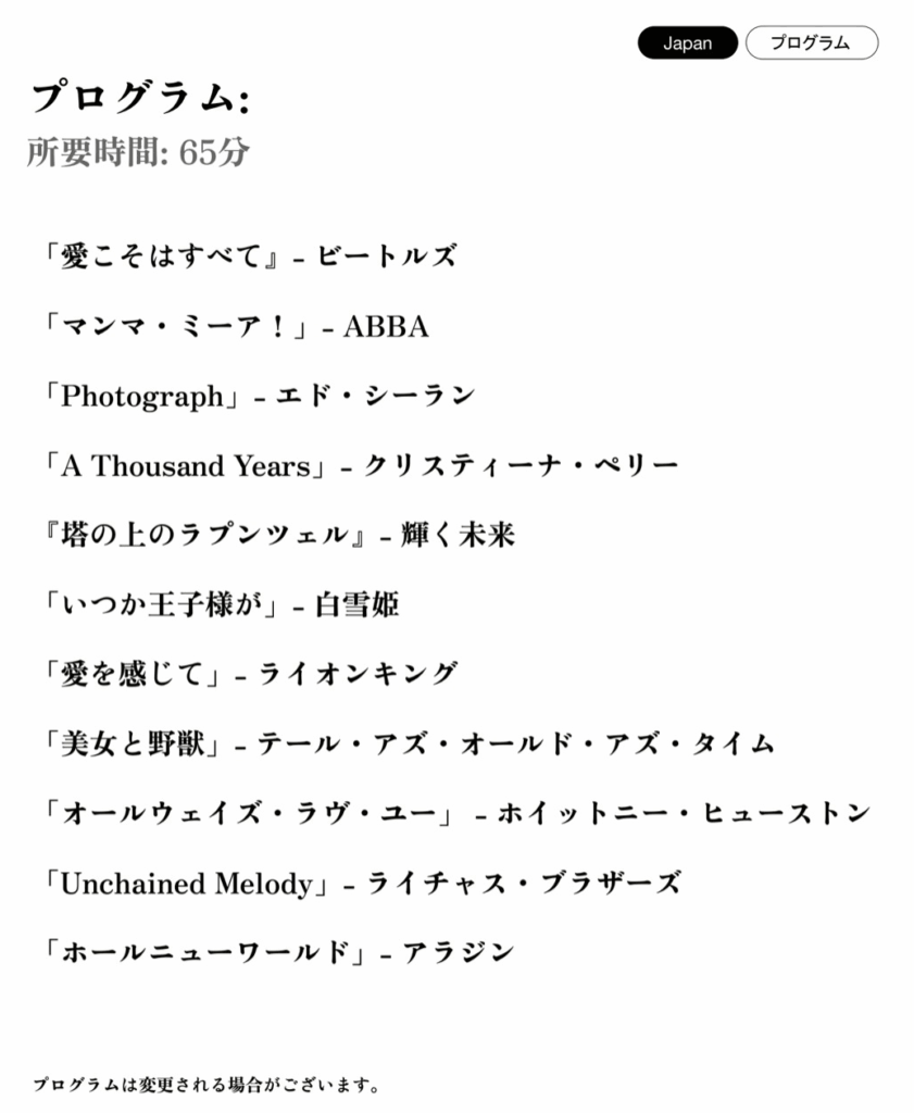 「バレンタインスペシャル」という名の通り、映画の名曲から誰もが憧れるディズニープリンセスのメロディまで、全世代の心に響く「愛」をテーマにした選曲が並びます。