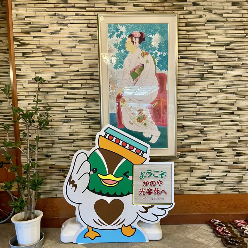 館内は落ち着いた和の雰囲気で、ロビーには可愛いマスコットのフォトスポットがお出迎えしてくれました。