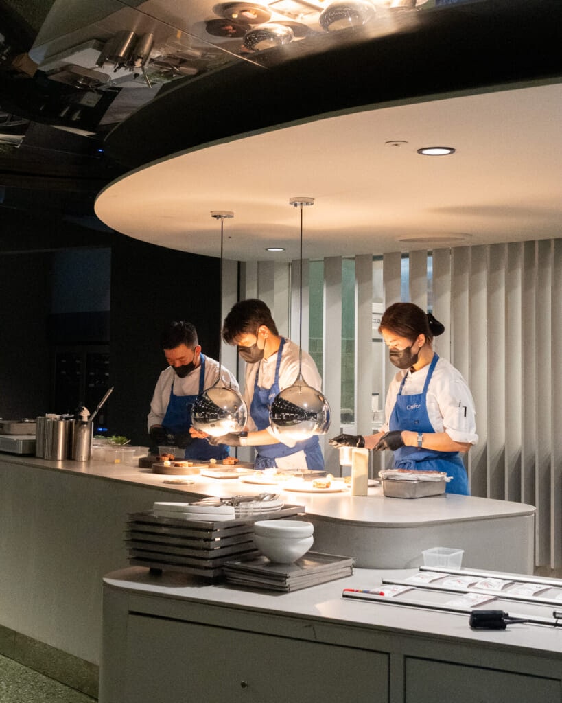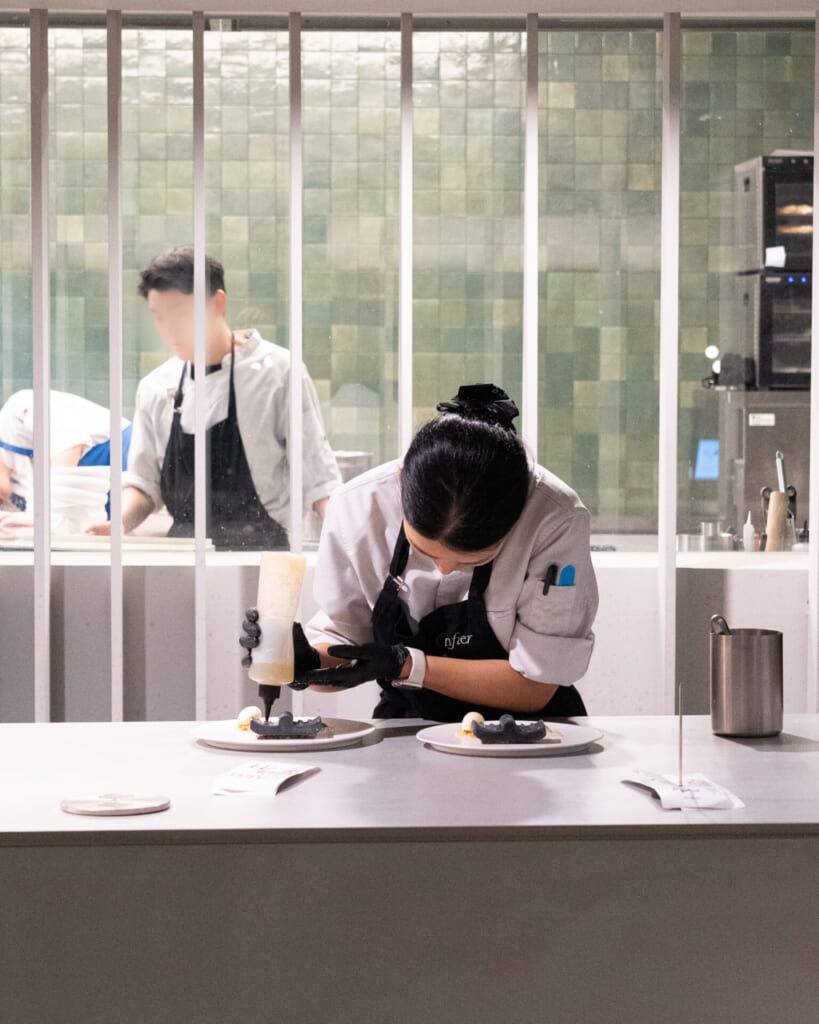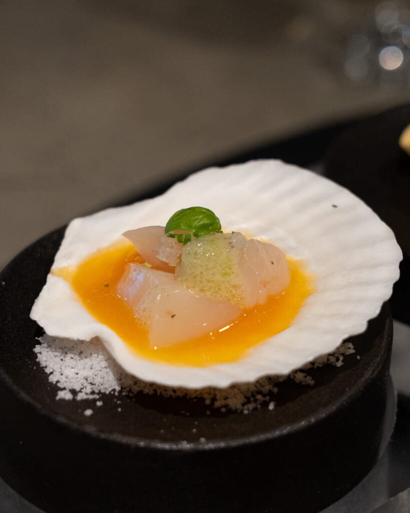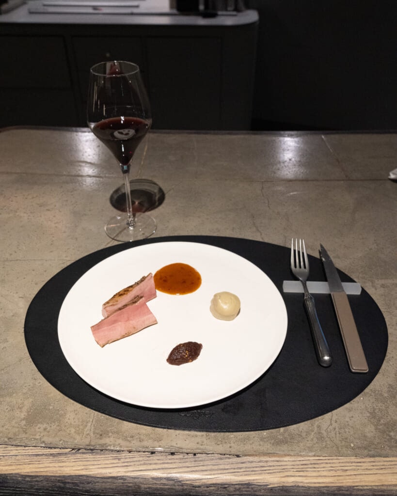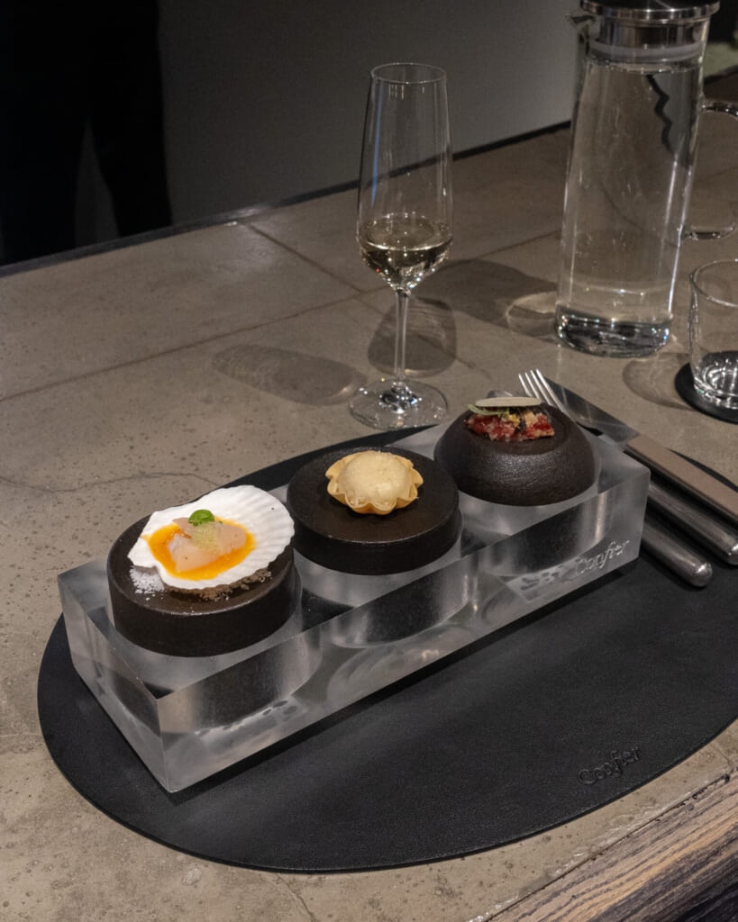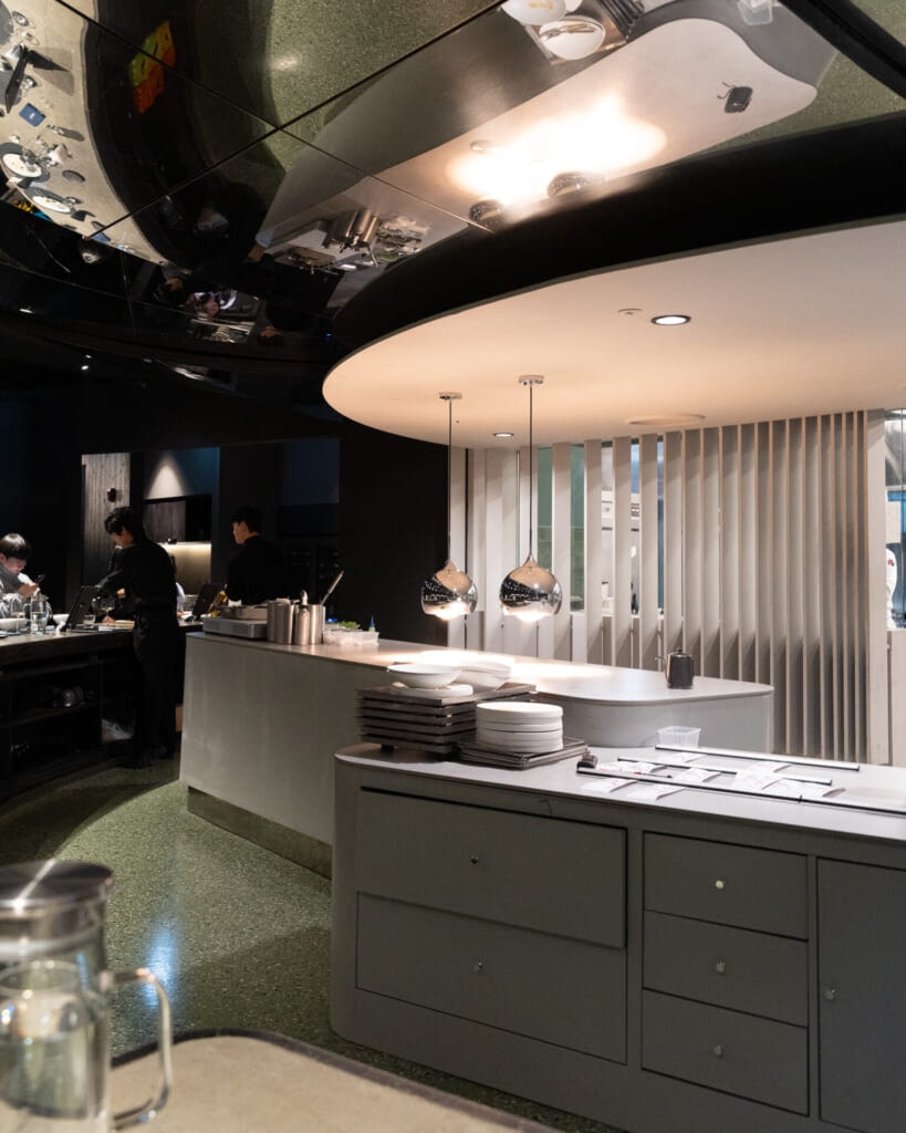 落ち着いた空気が漂う店内は、モノトーンで上品にまとめられていて、控えめな照明の中に料理がきれいに映えます。オープンキッチンの熱気やライブ感も印象的で、コースが始まる前から自然と気分が高まる空間でした。
