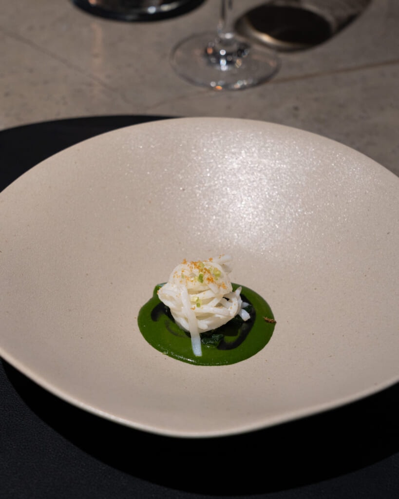 香ばしさのあるご飯に、低温調理でふんわり火を通したエビのシート、そこにセリの爽やかさが重なっていて、濃厚なのに重たくなりすぎない仕上がりです。