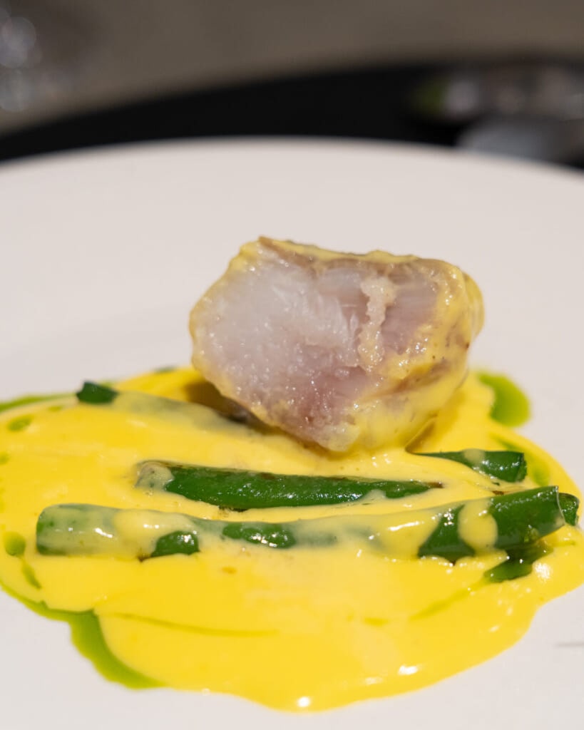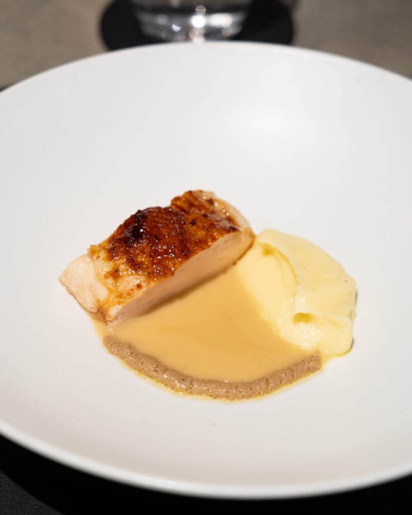 やわらかく火を入れたアンコウに、ハマグリの出汁とサフランを合わせたソース。インゲン豆の食感も心地よく、澄んだ風味がきれいにまとまっていました。