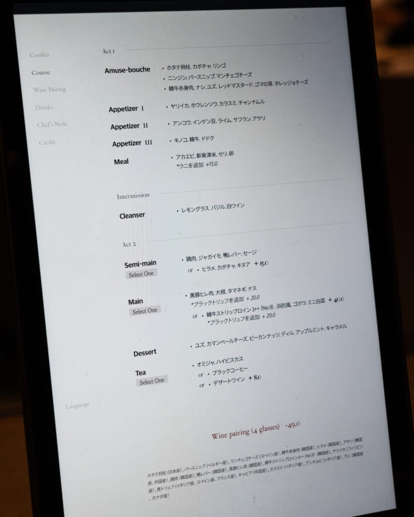 季節ごとに内容が変わるため、訪れる時期によって違った料理に出会えるのも魅力。今回いただいたディナーコースは全8品で、タブレットには多言語で料理の説明が表示されていて、内容を確認しながら食事を進められました。