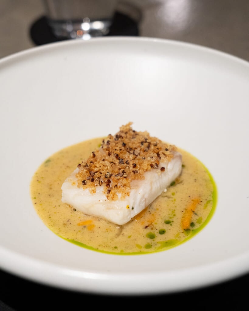 魚料理は、3日間熟成させたヒラメにカリッと揚げたキヌアを合わせた一皿で、食感の違いまで楽しめます。