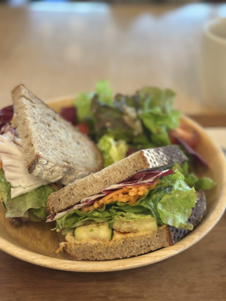 全粒系のパンに、レタス・にんじん・きゅうりなどの野菜がしっかり入っていて特にムフスがとっても美味しかったです。野菜中心で一見軽そうですが、具材の量が多く食べ応えは十分!味付けはシンプルで、素材の味が分かりやすく、ヘルシー志向でも満足感◎。