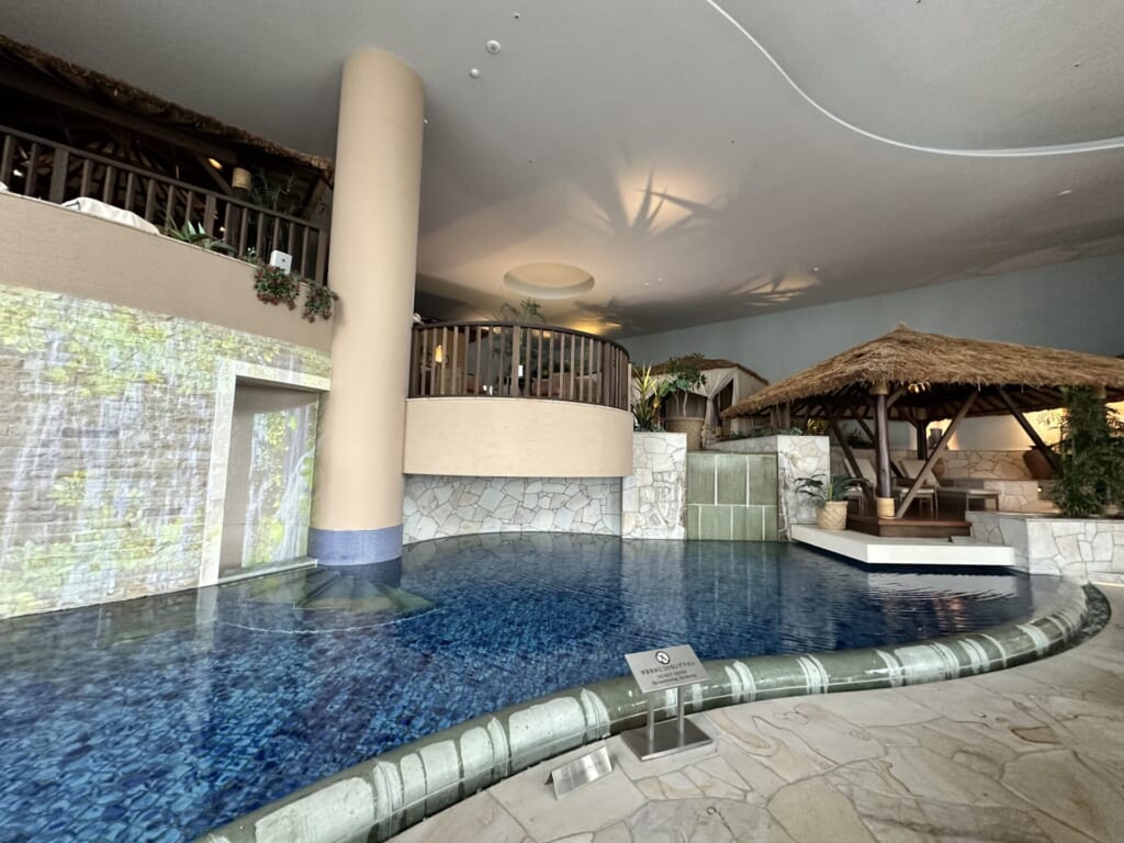 スパに入った瞬間、目の前に広がる青い石造りの美しい湯船…!