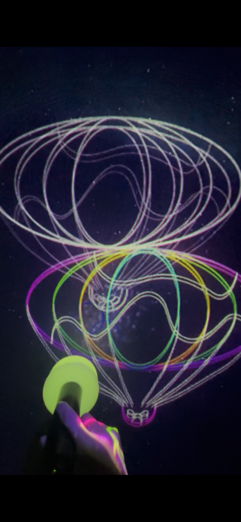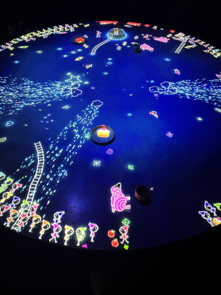 光のペンで引いた線は、その色ごとに「反発」「加速」「重力」といった固有の力を持ち、こびとの動きを変化させる仕組みがありまして!!スタンプを押せば新たな命が世界に出現して…描いた形が動き出すなど色彩と物理現象が混ざり合う面白い世界でした🌏✨