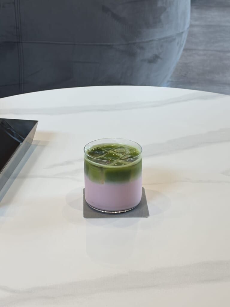 ドリンクは春らしい、グリーンとピンクのコントラスト。