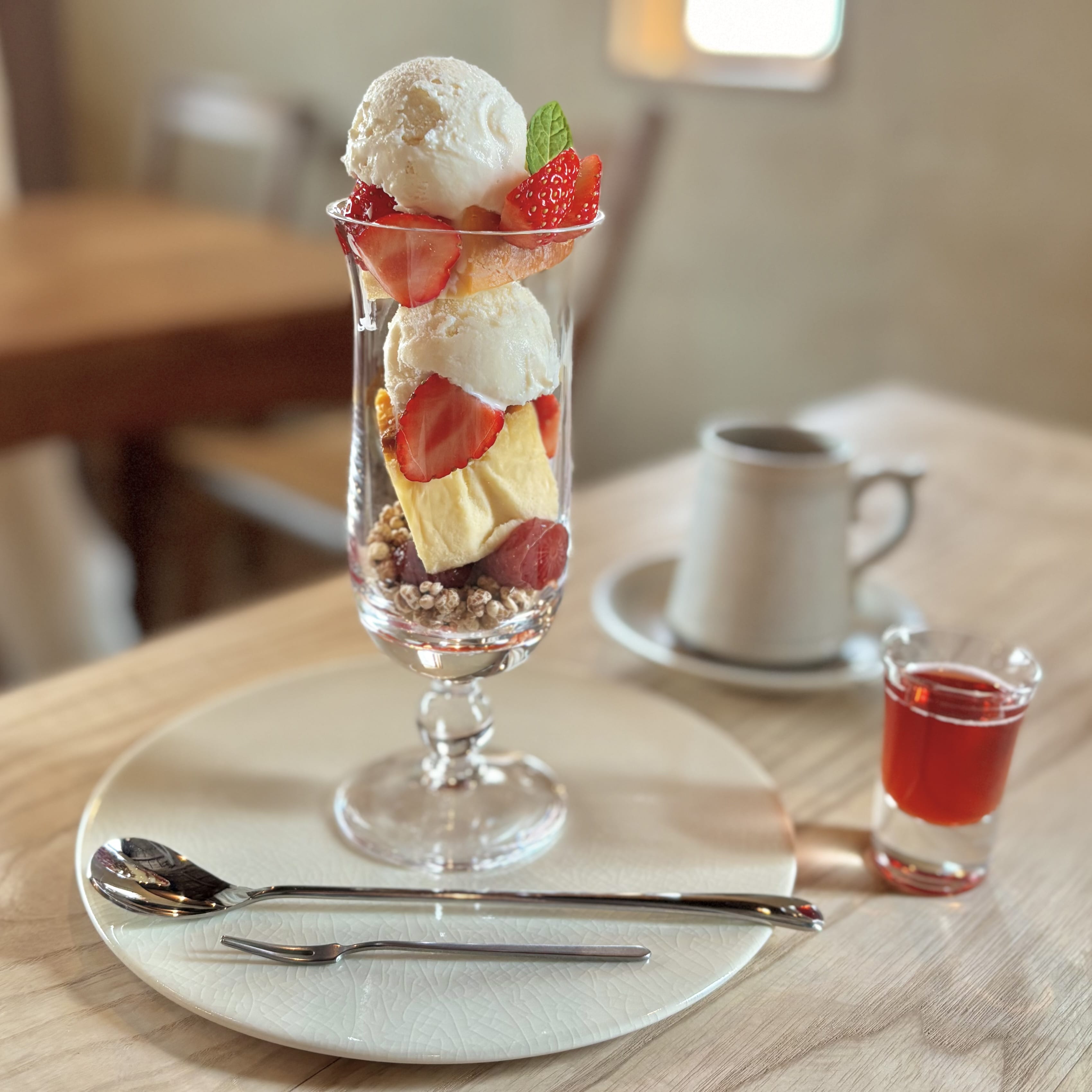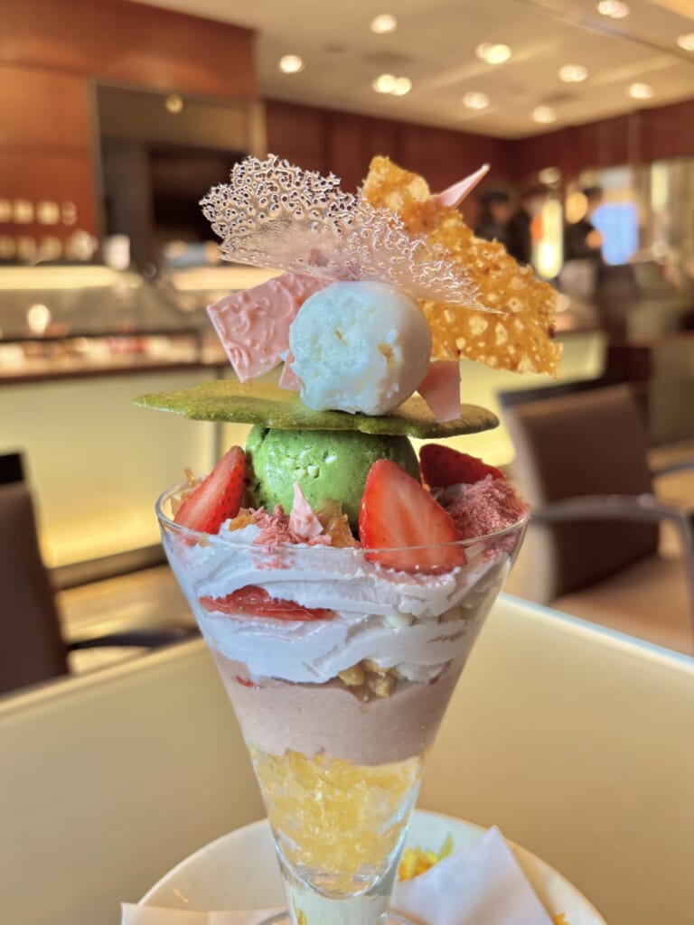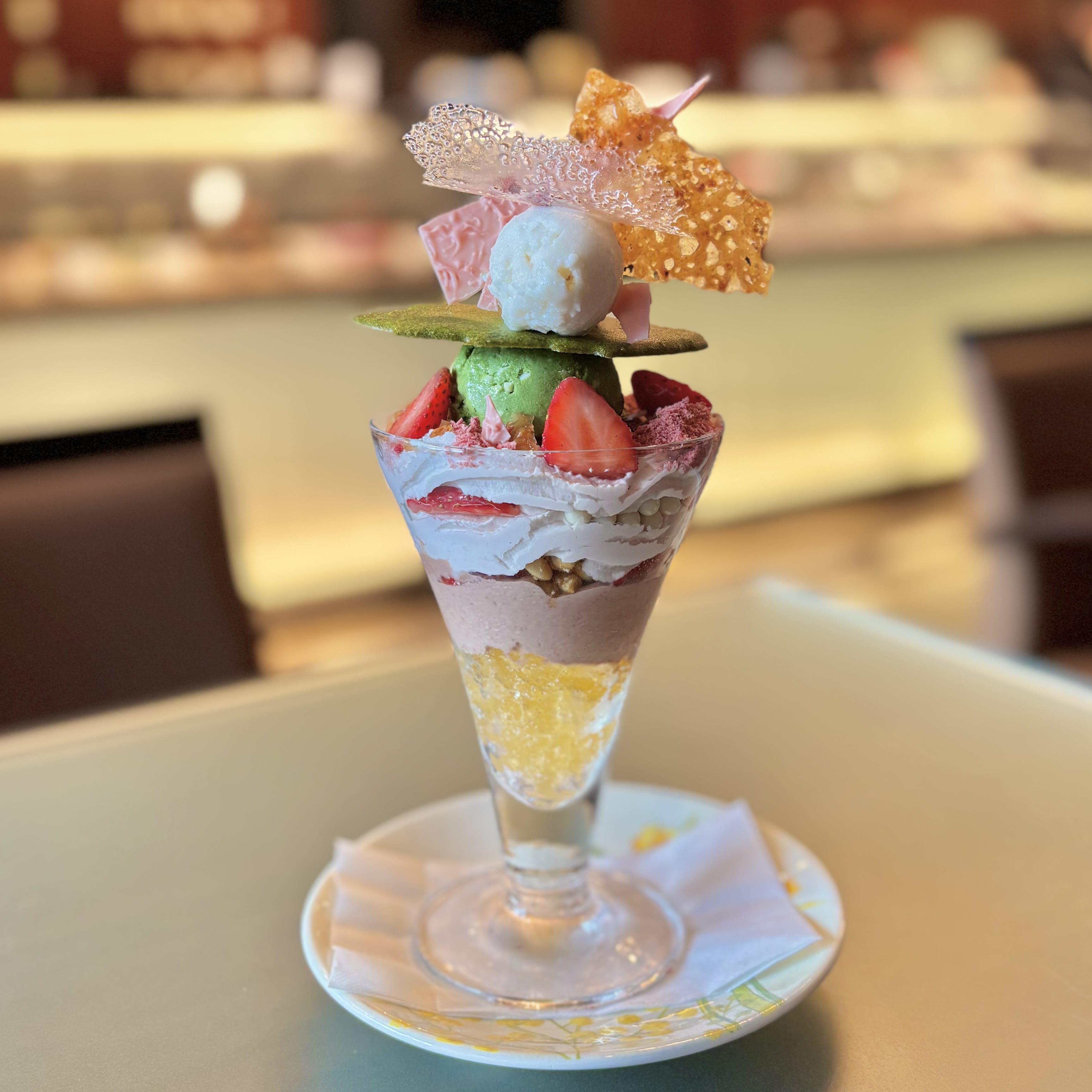 桜と抹茶が香る春いちごのチョコレートパフェ。