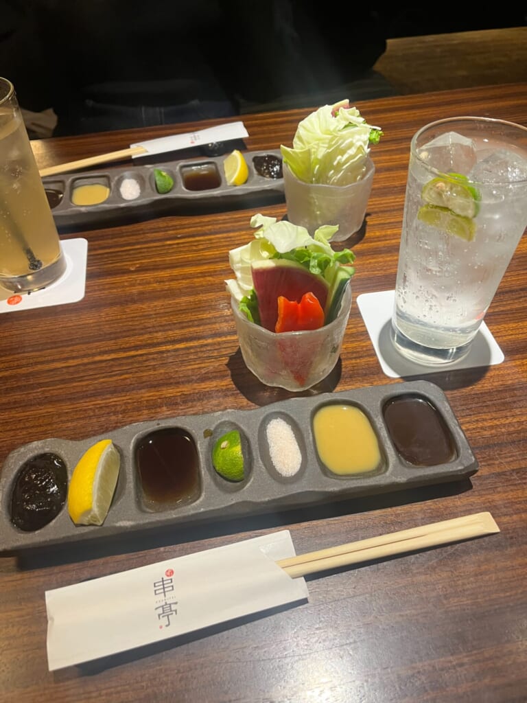 まずテーブルを彩るのは、瑞々しいおかわり自由のスティック野菜。自家製味噌で楽しみながら、特製ソース、塩、レモン、かぼす、酢味噌など、これから始まる串揚げへの期待に胸が膨らみます。
