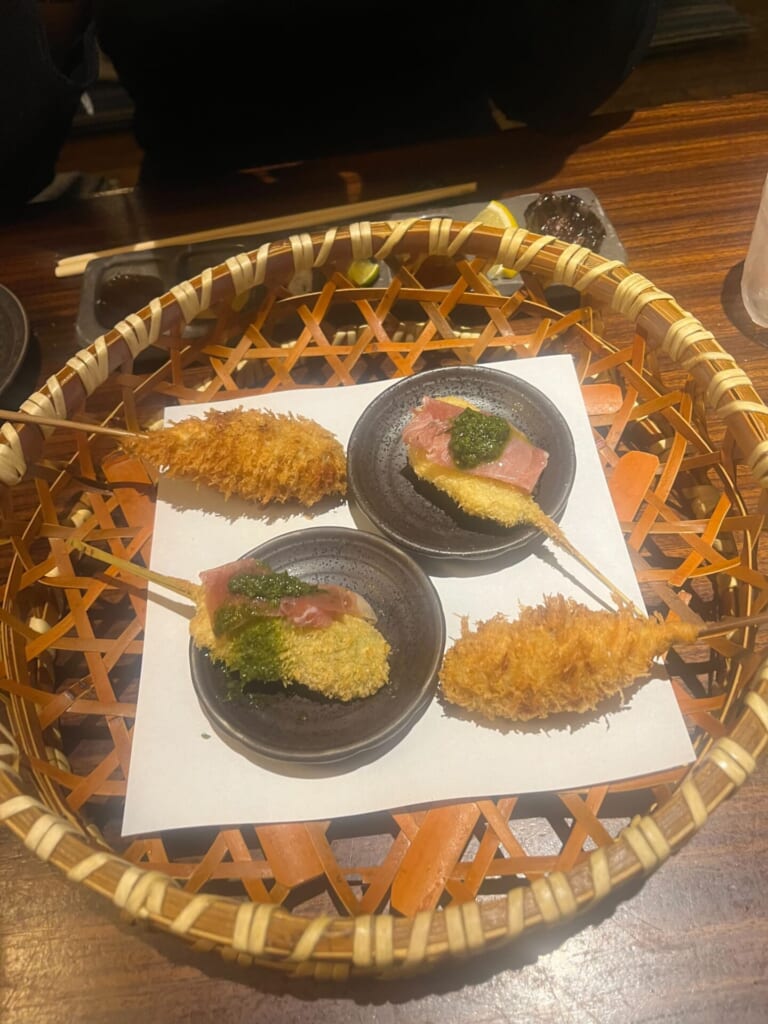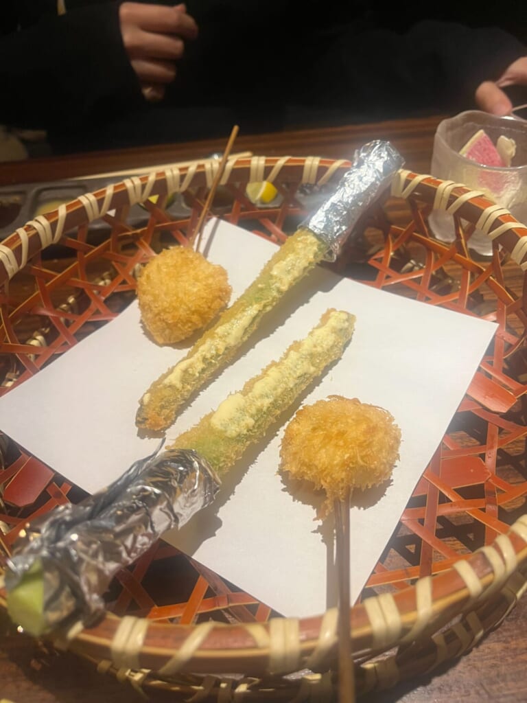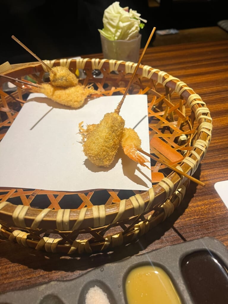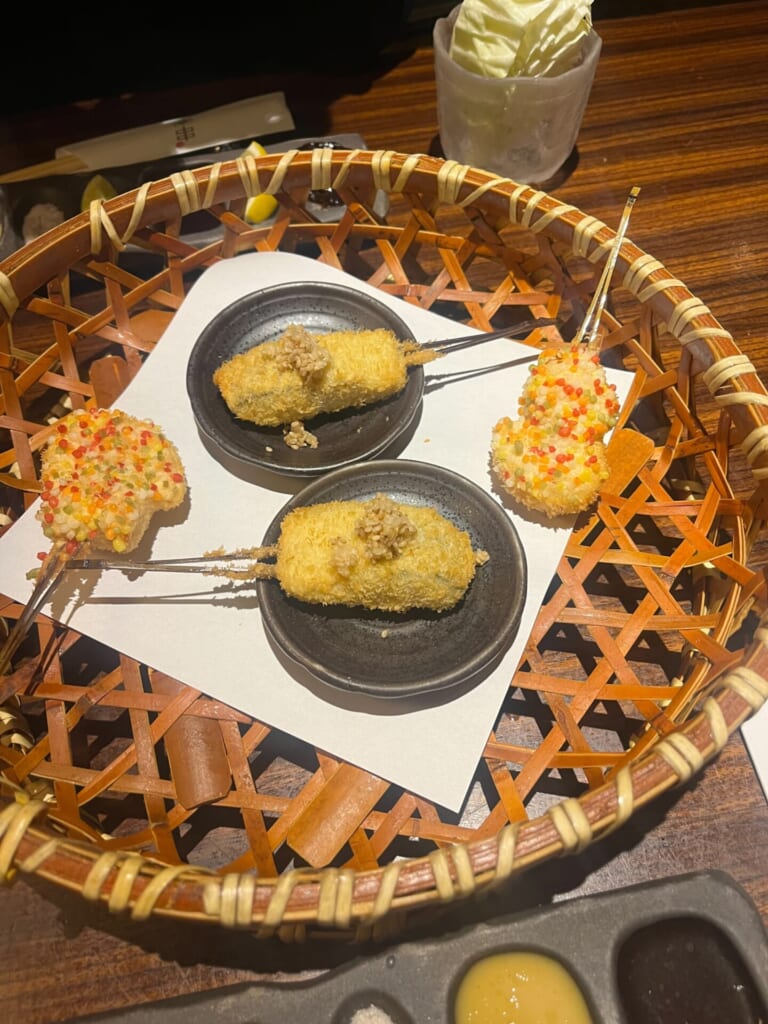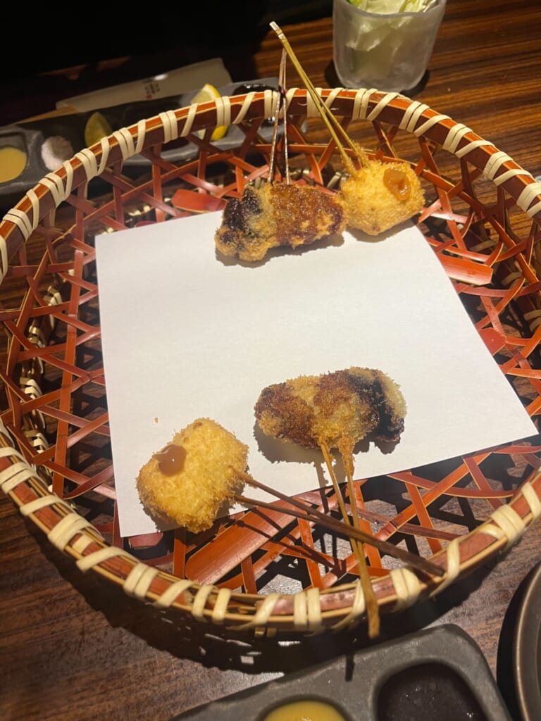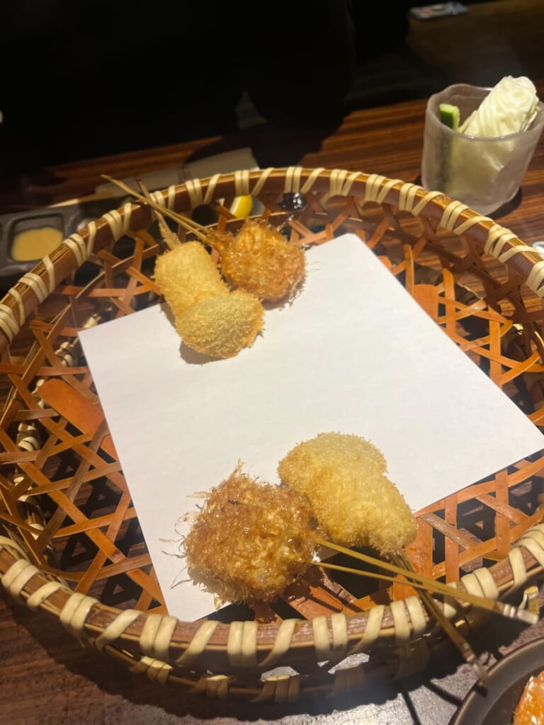 一串385円という明快な価格設定で、その時一番美味しい旬の素材を、揚げたての状態で2本ずつ提供してくれます。